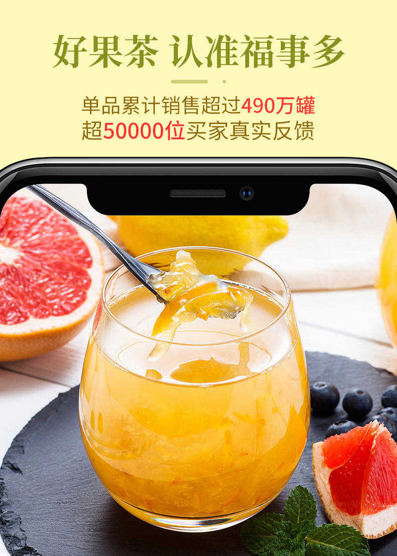 福事多官方旗舰店,天猫10年老店,这款蜂蜜柚子茶常年处于天猫同类中榜首的位置,也是福事多的招牌口碑产品,累计销量快500万瓶。强烈推荐!